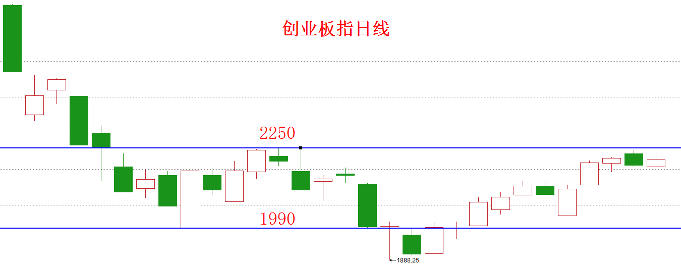 可以发现,如果我们以1990-2250点之间的箱体作为底部的话,创业板指早已翻回了底部下边沿,并且已经第一次触及到底部上边沿,现在所等待的正是何时发力突破上边沿。