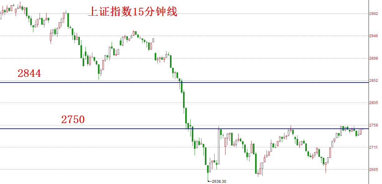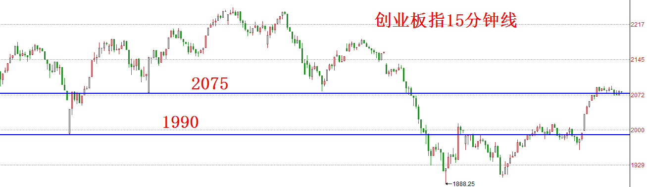 大盘再次回到2750点一线,短期反弹目标还是先看2844点。前文说过从2750至2844这一百点没有什么套牢盘,所以向上不会太困难,到了2844点上方才会遇到短期压力。其实,率先企稳反弹的创业板指今天已经触及相当于上证指数2844点的位置,如下图所示: