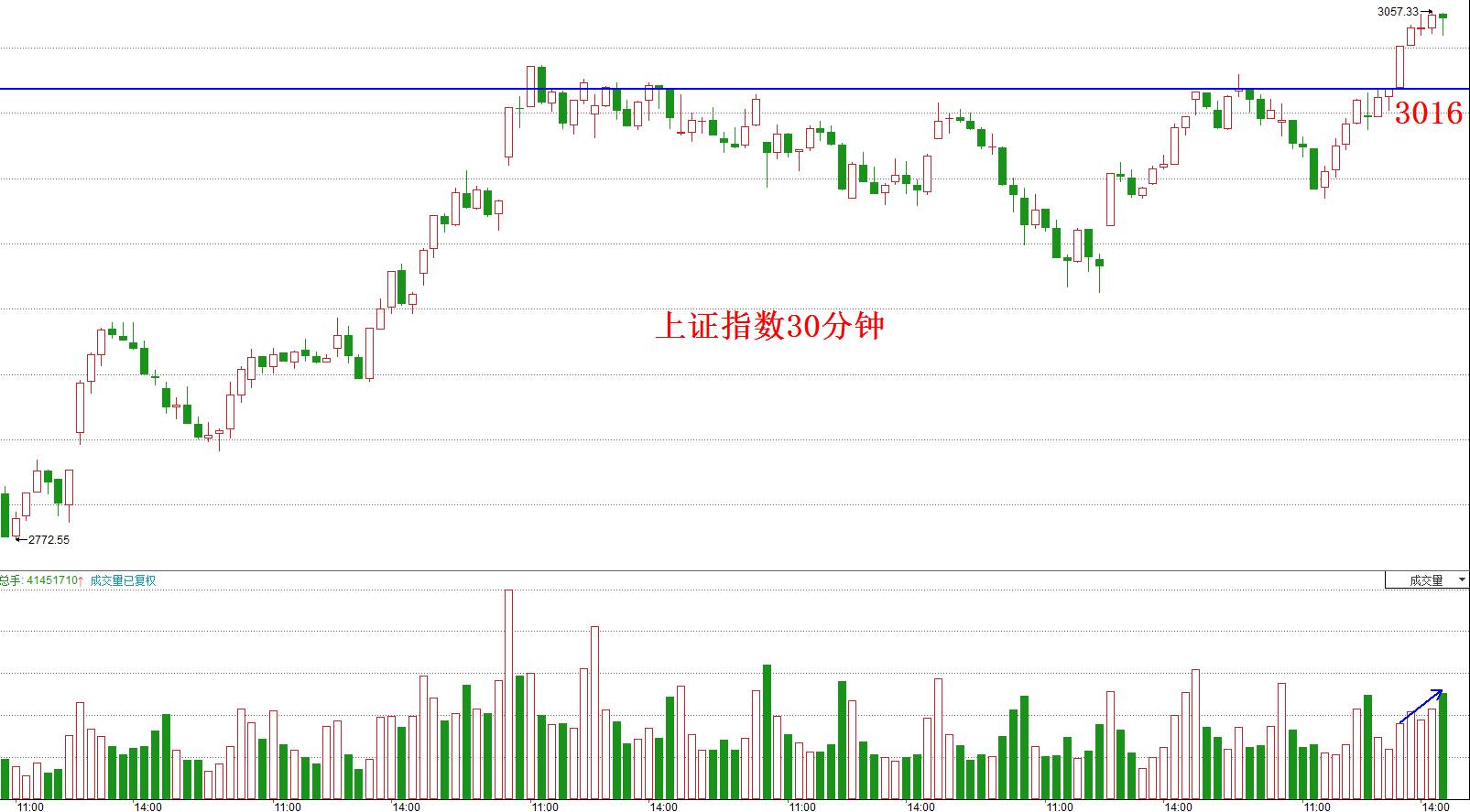 可以看到,今天上证指数真正出现放量拉升是从第四个30分钟开始的,K线图上也收出了一根中阳线。我们姑且假设今天的上涨是主力在发起一波新的攻势,那么发起点就应该算在第四个30分钟。也就是说,30分钟线上的第四根K线的起点,亦即3016点是主力发动进攻的阵地,这是不能被跌破的。因此,对于短线投资者而言,可以将止盈点设在3016点,只要不跌破该点位,投资者可以继续持股。一旦跌破3016点,投资者可以酌情降低仓位。