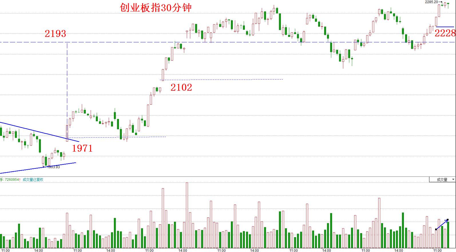 由于上证指数早已有效突破2934点的颈线位,相信创业板指有效突破2250点也是迟早的事。但以现在的成交量,要想持续大涨恐怕也是不现实的。我比较期待的走法,是创业板指短期冲高回落而后测试2250点一线的支撑,如果能够在该点位企稳,然后再放量上攻,那就会有一波比较可观的赚钱效应了。