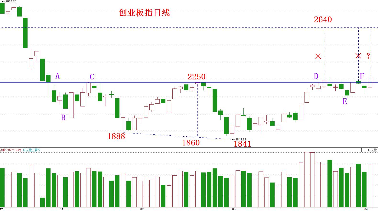 其实,在昨晚的文章中有一句话我忘记写了,那就是我们过去曾经多次提到过的股谚“屡测高点终会过”,也就是说,指数会一而再,再而三地冲击2250点一线的颈线位,那么相信它迟早是会有效突破的。所以昨天虽然下跌,但我对创业板指的中长期并不看坏,我相信它还是会涨回来的。记得创业板指在3月23日第一次突破2250点时,姚尧曾经提到这里有效突破颈线的可能性不大,更有可能是会再走一个类似于底部左边“ABC”的结构。现在来看,上图中的“DEF”基本上就与“ABC”相对应了。然而,姚尧对现在的盘面依然有所忧虑,理由与前述上证指数时类似,那就是指数创出新高,但成交量却未能跟着创出新高。除非接下来成交量能够持续放大,这样我们才能相信是有主力在玩真的。