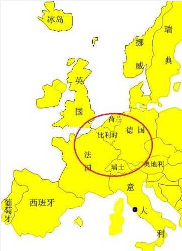 不知读者对2014年巴西世界杯还有多少印象?那一次欧洲共有十三支球队参赛,其中六支球队进入十六强,分别是德国、法国、荷兰、瑞士、比利时和希腊,而作为老牌劲旅的西班牙、意大利、葡萄牙和英格兰则悉数被挡在十六强之外。姚尧算不上资深球迷,也不知道足球专业人士是如何评析此现象的。但作为“下知地理”的我却惊讶地发现,除了希腊外的这五个国家在地理上竟然是紧紧相连,刚好位于如下图所示的红圆圈之内: