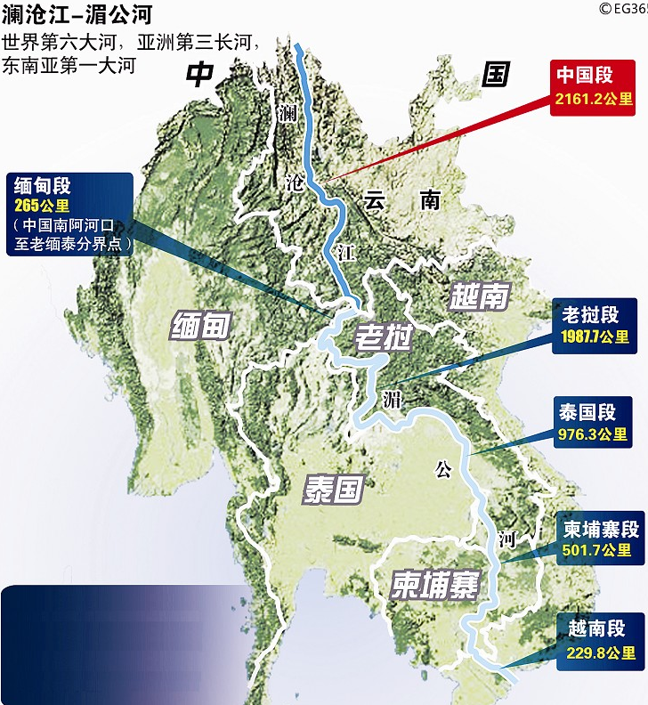 澜沧江-湄公河是东南亚第一大河,其在中国境内的部分称为澜沧江,出了中国的部分称为湄公河,流经老挝、缅甸、泰国、柬埔寨和越南,于越南胡志明市流入中国南海。如下图所示: