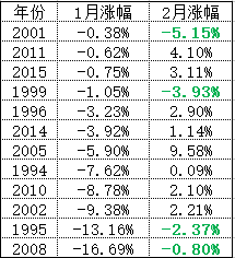 我们发现1月份下跌的十二年里,只有四年2月份是下跌的,而这两个月累积下跌幅度最大的也是2008年,为17.49%。也就是说,如果2月底的收盘价低于2920点,那么今年头两个月的表现也会是历史最差的。