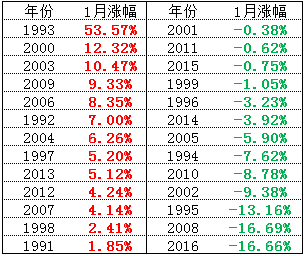 下面这张表是上证指数有史以来一月份的涨跌幅: