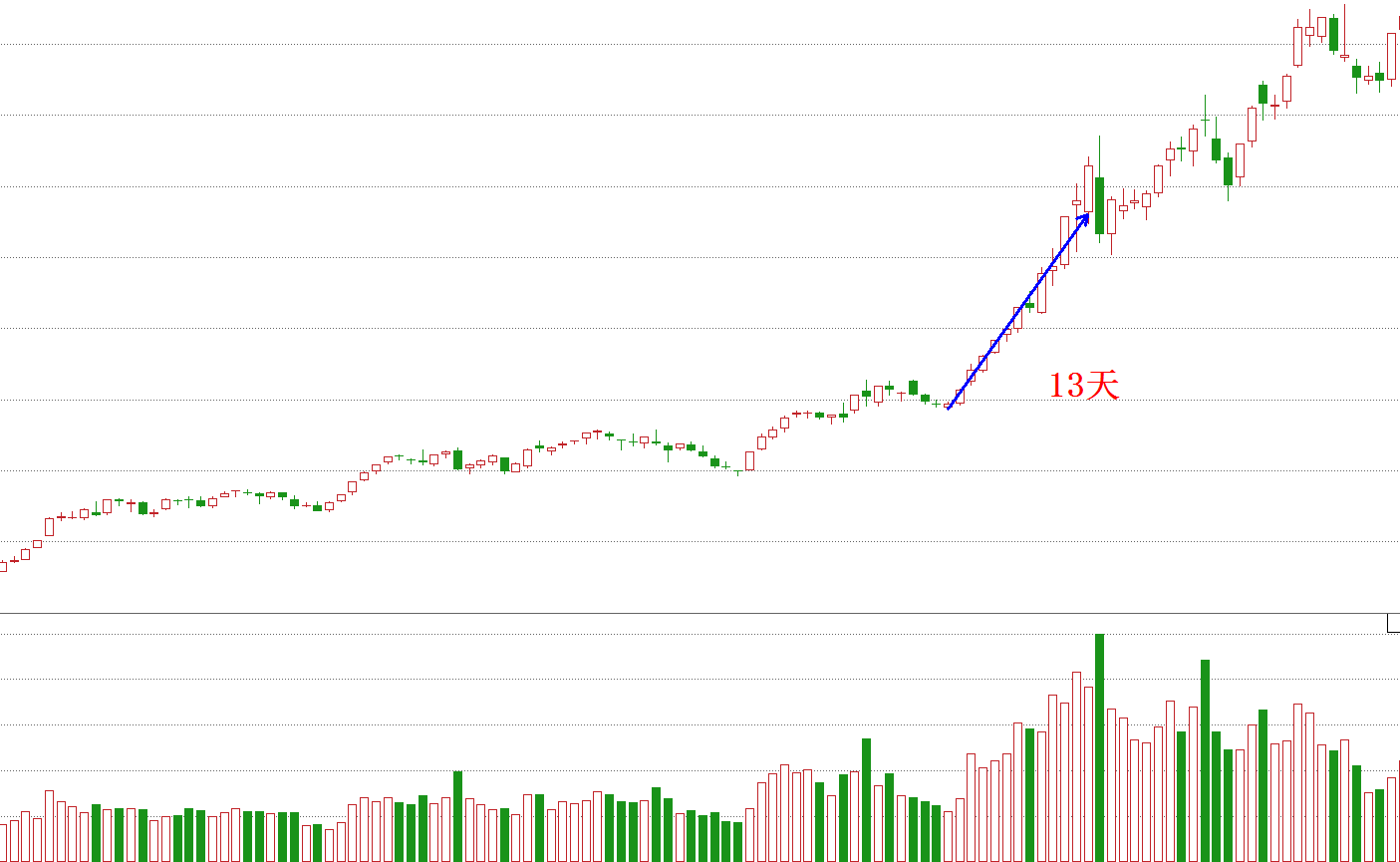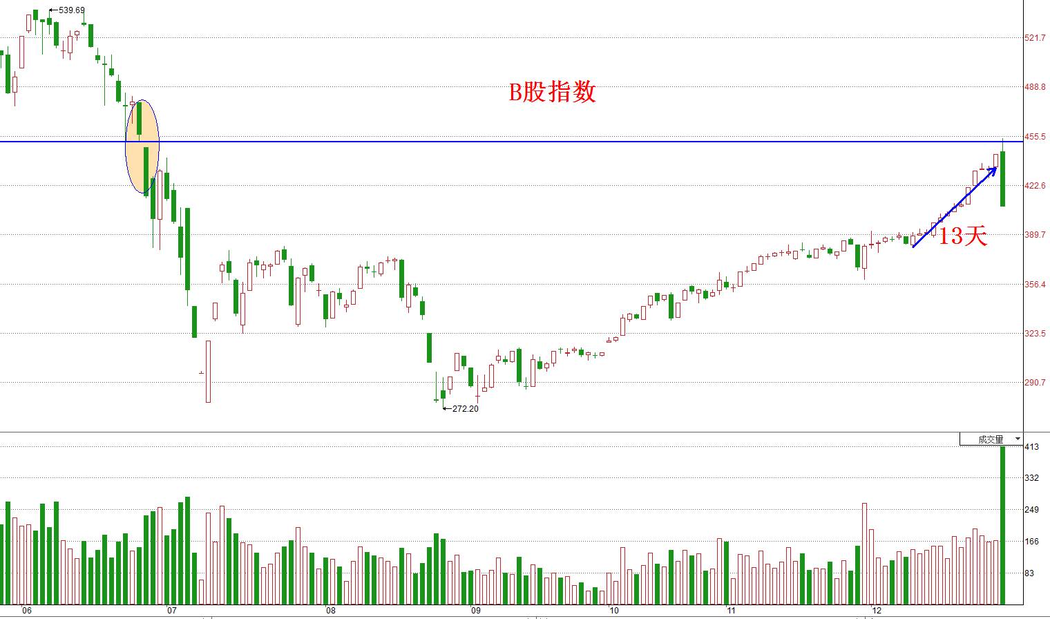 这其实就是2014年下半年上证指数的日K线图,自11月20日起同样是连涨了13天(仅12月1日这天微跌0.1%),之后就在12月9日这天出现了带上影线的天量暴跌,跟现在的B股指数像吗?你自己看它之后是怎么走的。