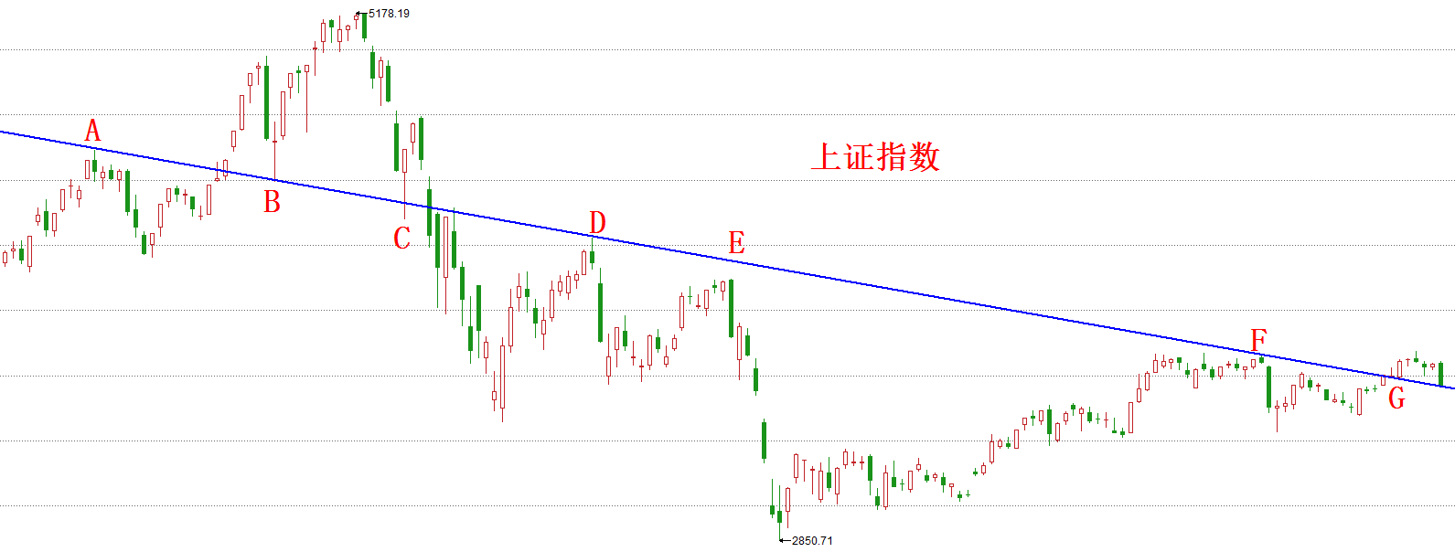 图中直线称为“X线”,与一般趋势线只是连接低点与低点(上升趋势线),高点与高点(下降趋势线)不同,X线连接的是波段高点与低点。上图中的X线是点A(4572点)和点B(4431点)的连线。X线画好后,读者可以发现,当指数第一次触碰到X线时(点C)是获得支撑并反弹的。反弹结束后,指数有效跌破了X线,之后每次反弹均是在靠近X线时就无功而返了(点D、E、F)。也就是说,当指数在X线上方时,X线为其提供支撑,指数在X线下方时,X线为其构成压力。