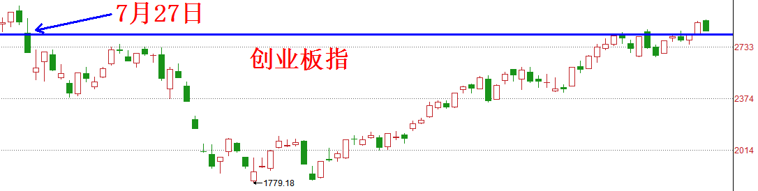 第三,早在《11月9日股市前瞻》,姚尧就指出7月27日的开盘价2822点会是较强的压力位。半个月来,创业板指也多次对这个点位发起攻击,我们引用“屡测高点终会过”的股谚,判断这个位置终究会有效突破。既然这条压力线已经在昨天被有效突破,未来就理应构成强力支撑。如下图所示: