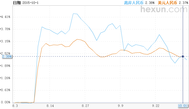 下面这张是自八月以来美元/离岸人民币(蓝色)和美元/在岸人民币(橙色)的走势图