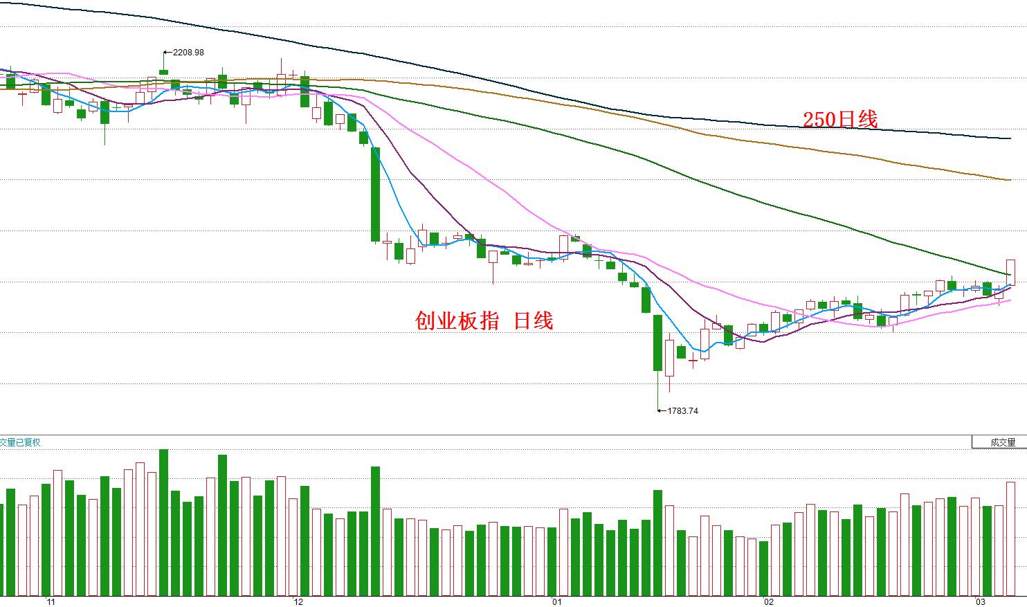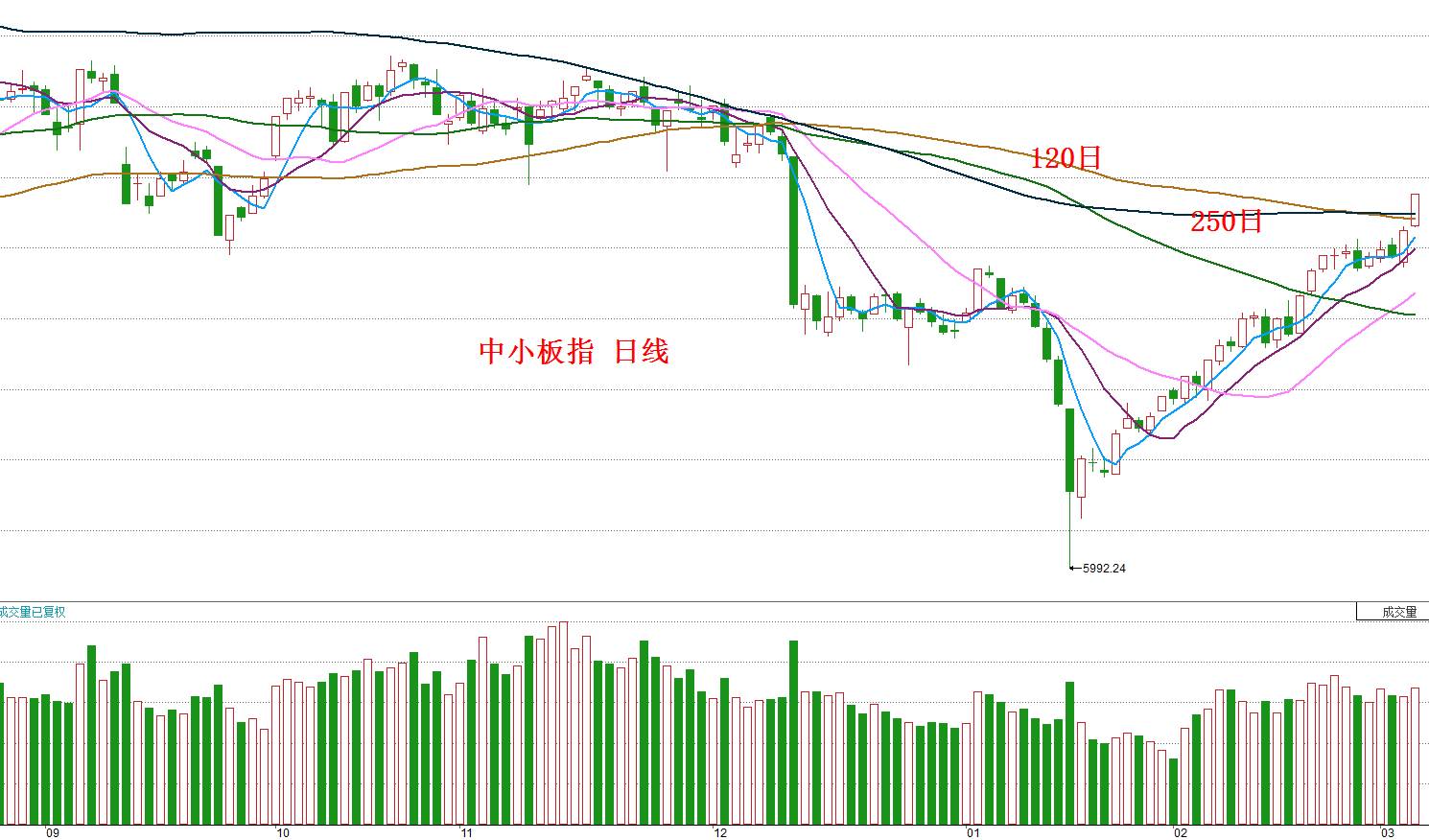 当然,我们过去反复提到,在创业板指未能有效站上250日均线之前,不对其战略做多,现在仍然遵守此纪律。但可喜的是,中小板指今天终于站上了250日均线,如下图所示: