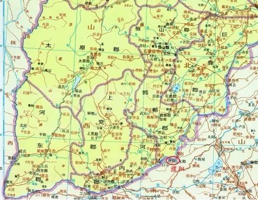 当王离经由上郡东渡黄河进入太原郡时,正遇上赵王武臣派出将领四处略地。其中李良自邯郸郡率军北上,已经攻占了太原郡以东的恒山郡,正准备向西攻占太原郡,张黡自邯郸郡率军西征,已经攻占了太原郡以南上党郡,正准备向西攻占河东郡,如下图所示: