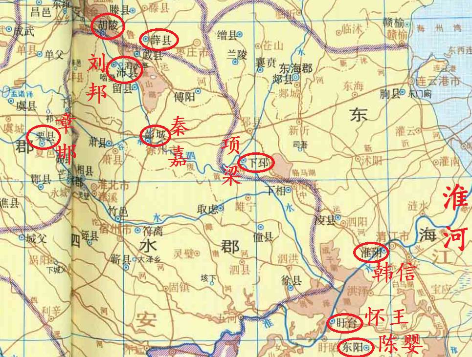 项梁收编陈婴的两万人马后,继续向北渡过淮河,淮阴(今江苏淮安)人韩信就是在这个时候仗剑从军的。渡过淮河后,陆续又有英布、蒲将军等率军来投,至屯军下邳(今江苏邳州)时,军队已有六七万人。