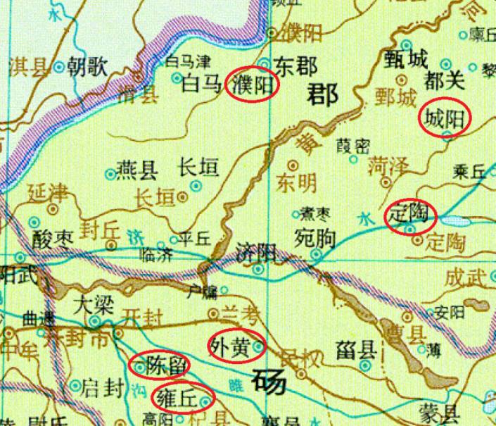 项羽、刘邦先是引兵东向进攻城阳,城破之后对其实施屠城。接着南下进攻定陶,由于城池防守坚固,迟迟未能得手,遂舍弃定陶而继续南下,阻击从西边前来驰援的秦军。在雍丘,项羽、刘邦大破秦军,斩杀援军统帅、三川郡守、秦丞相李斯之子李由。随后挥师北上进攻外黄,项梁主力则因章邯困守濮阳不出,遂南下围攻项羽、刘邦此前未能攻入的定陶。如下图所示: