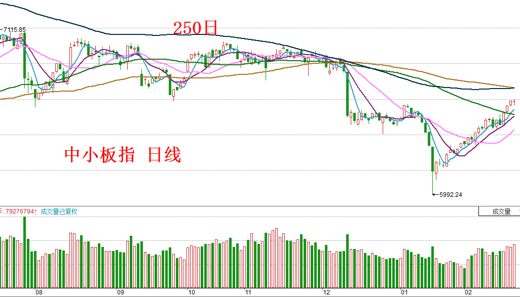 中小板指今天的收盘价在6628点,250日均线的位置在6713顶,其实也就1.5%左右的距离,且其250日均线的运行趋势还是震荡下降,被指数越过是迟早的事,无论如何上半年至少应该会有一波行情。请再看下图: