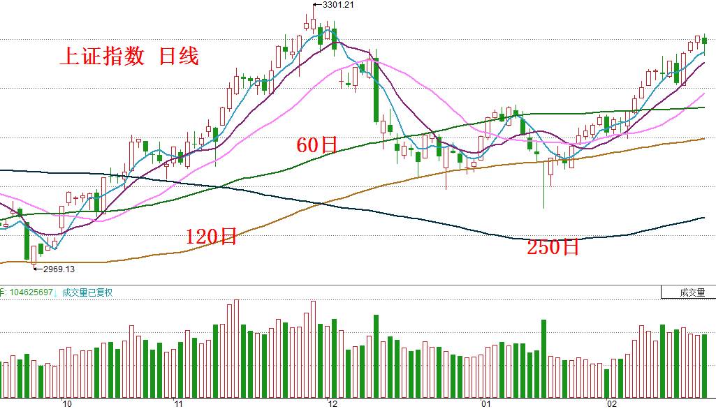 我们看到,自从一月中旬以来,上证指数始终是在蓝色通道内运行,通道角度约40度,虽还谈不上陡峭,但也不算太平坦了。上证指数前天和昨天都是贴着轨道上沿缓步推进的,如果今天大涨的话,上证指数将脱离既有上升轨道,就好像人跑步时突然加速一样。要维持更快的速度奔跑,就需要消耗更多的体力;如果体力不够的话,就会因为消耗过快而提前结束奔跑。同样的道理,上证指数若想要突破轨道上行,就应该要有成交量的支持;如果突破上行而又没有成交量支持,那么就算突破也不会走太远,这也就是姚尧近几天一直特别强调成交量的原因所在。现在上证指数小幅回撤,我反倒心里更踏实了,最好它就在轨道里缓慢往上挪。