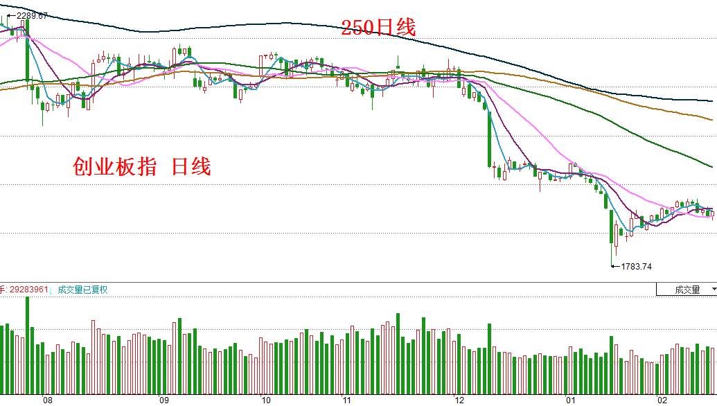 那么,市场情绪什么时候能到创业板呢?读者应该记得,我们去年反复强调过,在创业板指未能站上250日均线之前,不对其战略做多。上证指数自去年10月就已稳稳越过250日均线,而创业板指至今仍然有很长一段距离,如下图所示: