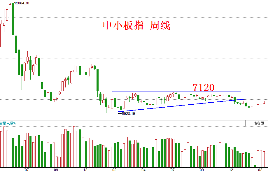 那么,7200点又是什么位置呢,请再看下面这张中小板指周线图: