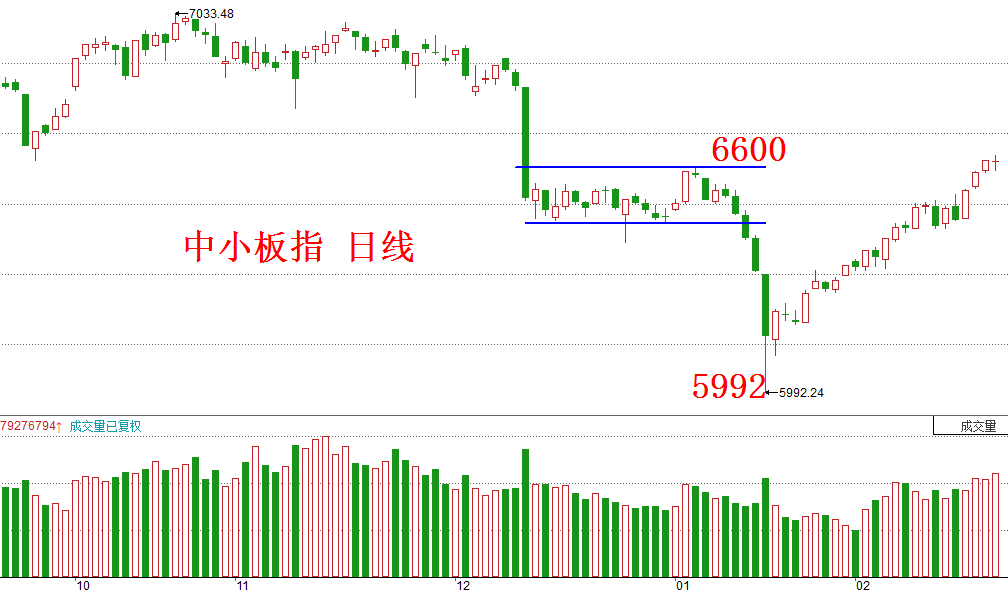 中小板指自去年12月12日至今年1月12日构筑了一个矩形,之后快速跌破而现在又已经全部收复。你可以把它叫作V形底,也可以把它视为破底翻,但无论如何,这个底部形态做出来后理应还有一波向上的涨势。中小板指这最后一波是从6600点跌至5992点的,现在既然已经收复前期平台,那么未来的第一目标位就是向上再涨600点,即涨到7200点,距离现在理应有10%的涨幅。