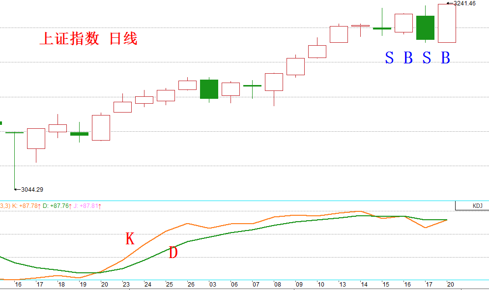 于是,我就仔细研究该软件是如何给出买卖决策的。经过半分钟的大胆假设和一分钟的小心求证,我终于明白,这完全是根据KD指标来的!
