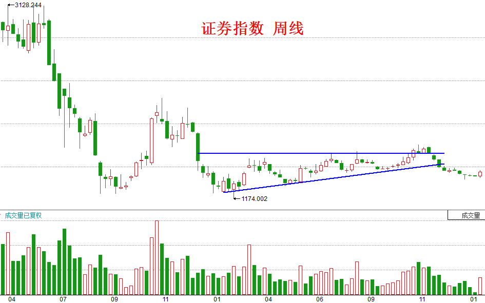 说来说去,这又涉及到那个老话题,投资究竟应该是分散和集中。姚尧在过去的文章中强调过很多次,我坚定不移地主张分散。很多人说,唯有集中精力才能让投资决策更准确。但以我自己的经验而言,分散是一种更符合人性的操作方法,它首先承认每个人都有不足之处,故而无论你是如何天纵英明而又小心谨慎,最终都难免会犯错误。我们无法保证自己永远不犯错误,所以只能退而求其次,力图使自己犯错误时付出的代价要尽可能小,不能伤筋动骨到失去东山再起的机会。自去年十月以来,姚尧陆续在文章中提示了煤炭、券商、农业、环保、零售、机械、水泥等板块的投资机会。现在回头来看,除了券商外,其它板块的收益都还算过得去。我们现在来看下面这张证券指数周线图: