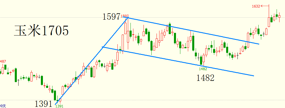 显然,这是已经构筑一年多的头肩底,现在即将向上突破颈线。即便近期无法突破颈线而回落,那也不改现在是底部区域的本质,无非是底部时间被延长罢了。我们再来看下面这张玉米1705合约的日线图: