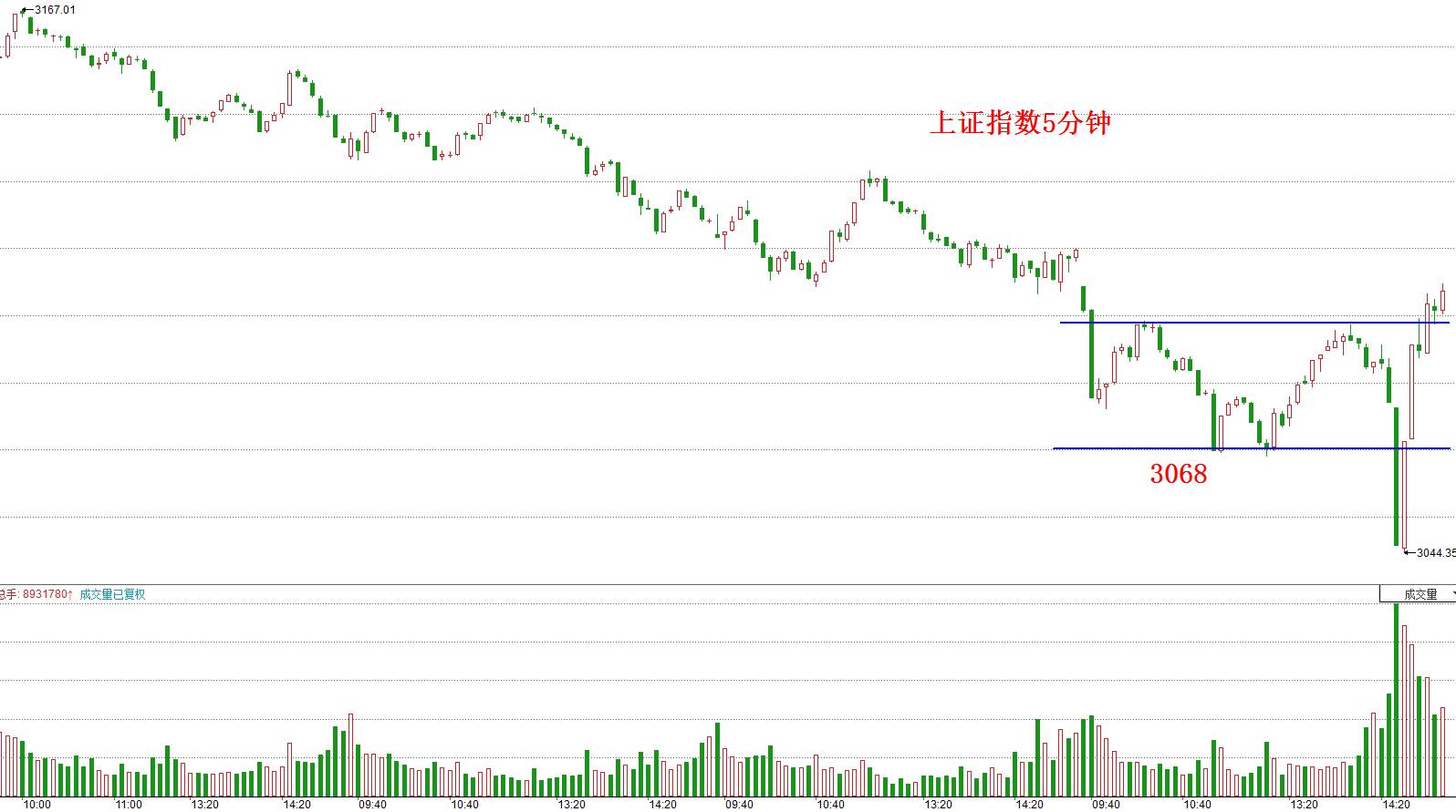 在昨天的文章中跟大家谈到破底翻,今日上证指数就演示了一遍破底翻,请看下面这张5分钟线图:
