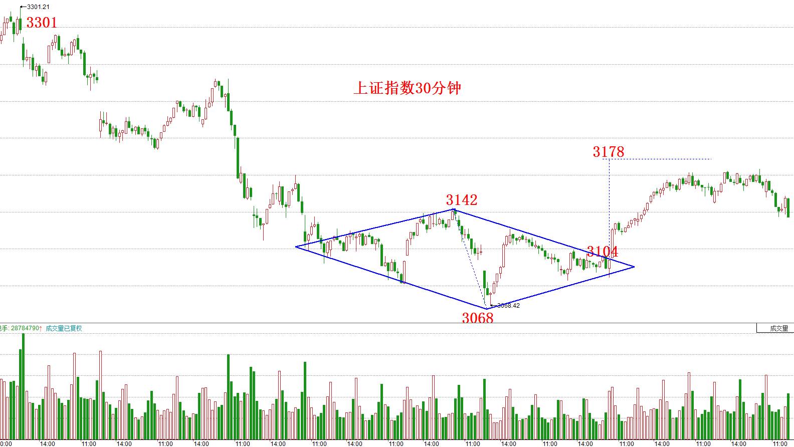 自从1月3日跳空上涨后,我们就在当晚的文章中说上证指数走的是菱形底,同时计算出涨幅目标位在3178点,而今上证指数最高涨到3174.54点而后下跌,可说是完全命中。