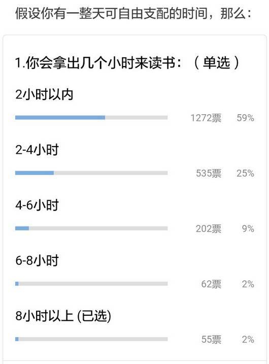 我粗略计算下,对于绝大多数人来说,双休日能够有一整天自由支配时间就不错了吧?而那些只肯拿不到2小时来读书的人,基本上也无法期待他工作日会读书。换句话说,60%的投票者每周读书的时间不会超过2小时,75%的投票者每周读书的时间不会超过5小时。所以假设我们的天赋是完全一样的,而我的阅读时间是你的十倍,那我所了解的知识是你十倍又有什么好奇怪呢?