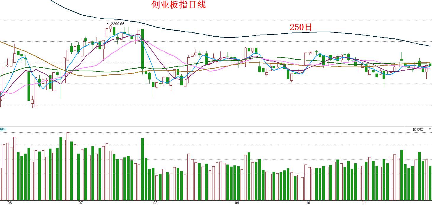 在《11月8日股市前瞻》的末尾,姚尧写道:“我们一直强调250日均线对于趋势的重要性,现在上证指数早已越过250日均线,而中小板指和创业板指的250日均线仍然高高在上,看起来指数短期内还无法站上,是以我们现阶段要对它寄予太高期待真的是不太现实。当然,我们说的是短期,或者说是中短期,长期的话我们仍然非常看好创业板。以姚尧的推算,在今年剩下不到两个月的时间内,或许上证指数的走势仍然明显强于创业板指,这就会给市场绝大多数投资者造成一种创业板完全没有前途,必须赶紧换到主板的错觉。等到持有创业板的投资者纷纷割肉换到主板,创业板指的250日均线差不多也该掉下来,与其它短中期均线纠结了。如果市场真的这么走,那就等于重演两年前的故事。”