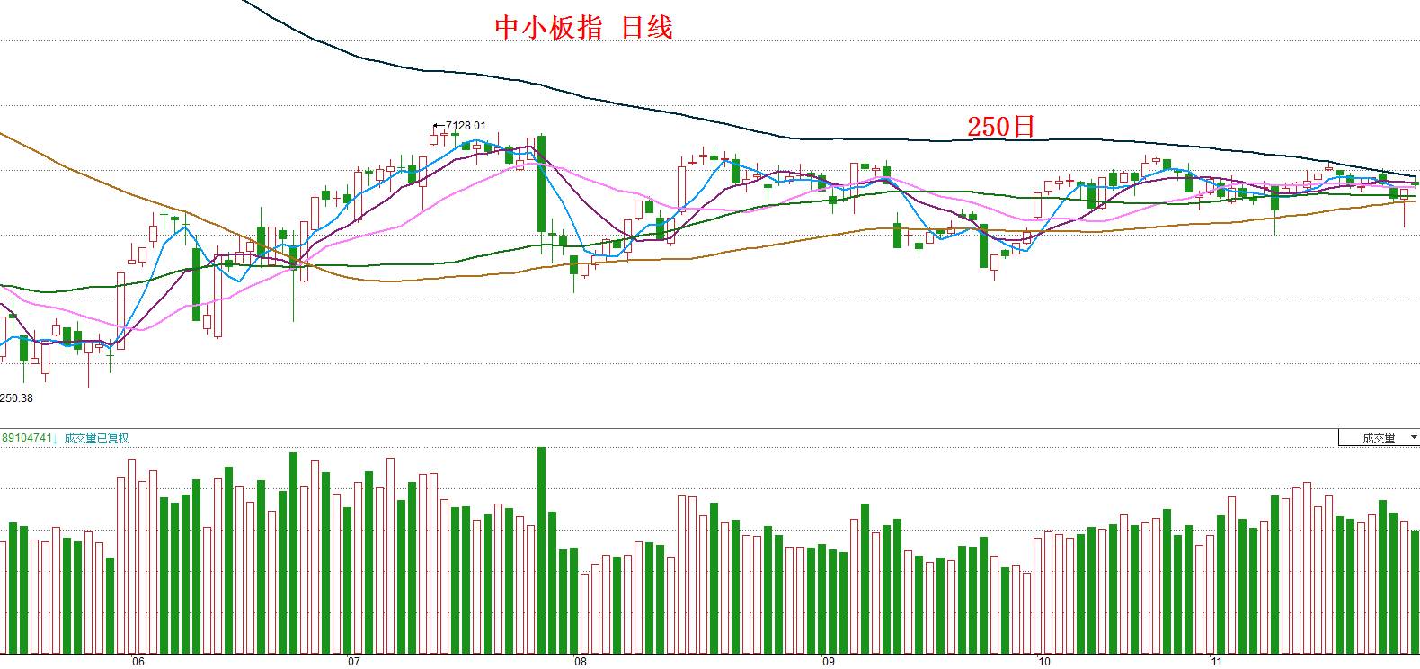 我们看到,随着时间的流逝,250日均线也在逐步下移,今日中小板指已经是第三次触碰到250日均线了,且与其余短中期均线即将形成纠结。由此可知,在散户投资者越来越热衷于追逐权重股之际,中小板的投资机会正在逐渐显现,读者纵使现在还不急于建仓,至少也应该开始积极选股了。