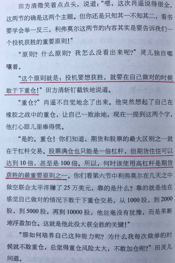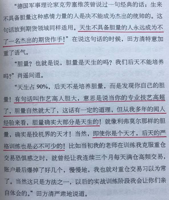 另外,作者又借田方清之口说“艺高人胆大,随着技艺的提高,胆量自然就也跟着提高了。”对此我也持相当怀疑的态度。在我看来,每轮牛市初期,投资者都是很胆小的,因为市场舆论都很悲观。到了牛市末期,投资者个个都很胆大,不但重仓还拼命加杠杆。显然,他们的胆量大并不是因为技艺提高,而是市场趋势让他们赚到钱,使得他们自以为技艺提高。事实上,上天欲使人灭亡,必先令其疯狂,就是为了让他万劫不复,才会想让他有胆量。