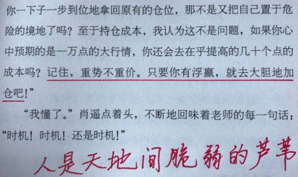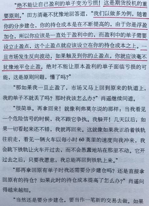 我当时之所以会写下“人是天地间脆弱的芦苇”这句话,是觉得刘强先生低估了世界的诡谲,而又高估了人力的坚强。按照作者书中的策略,做期货的原则是必须要重仓。具体的操作是:一开始拿小资金试仓,如果出现亏损,那就表示对市场趋势判断错误,此时要么止损出局,要么继续持有,但无论如何不能加仓了。如果试仓的资金有盈利,那就继续加仓。由于期货是保证金交易,随着你盈利的增加,可以加的仓位也在增加,从而形成良性循环。一旦趋势反生改变,就要及时止盈出局,而止盈点也必须设在成本之上,绝不能让盈利的单子变成亏损。