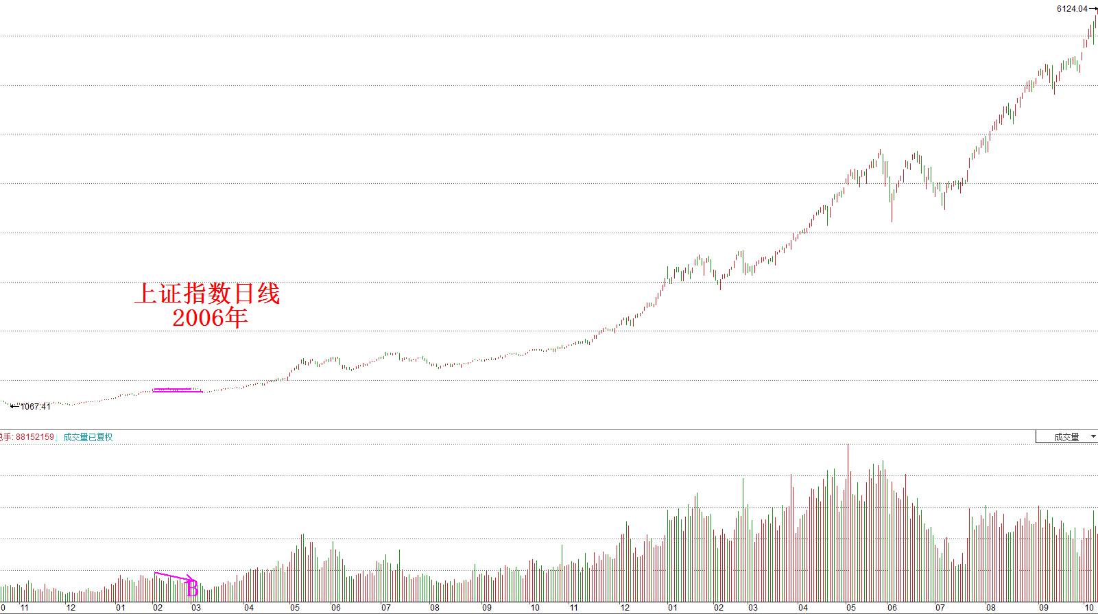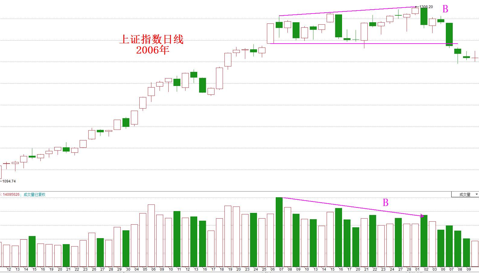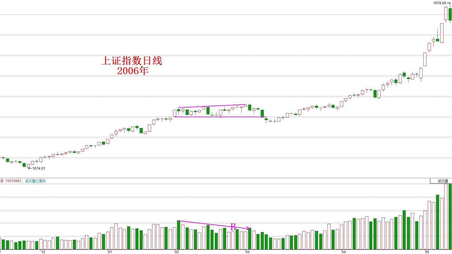 再说B处,同样是指数震荡走高,而成交量持续萎缩,但这次量价背离的时间比较长,从而导致接下来向下挖的坑也比较大,待到一个月后才通过放量阳线来化解背离,再之后便是一路飙升了。