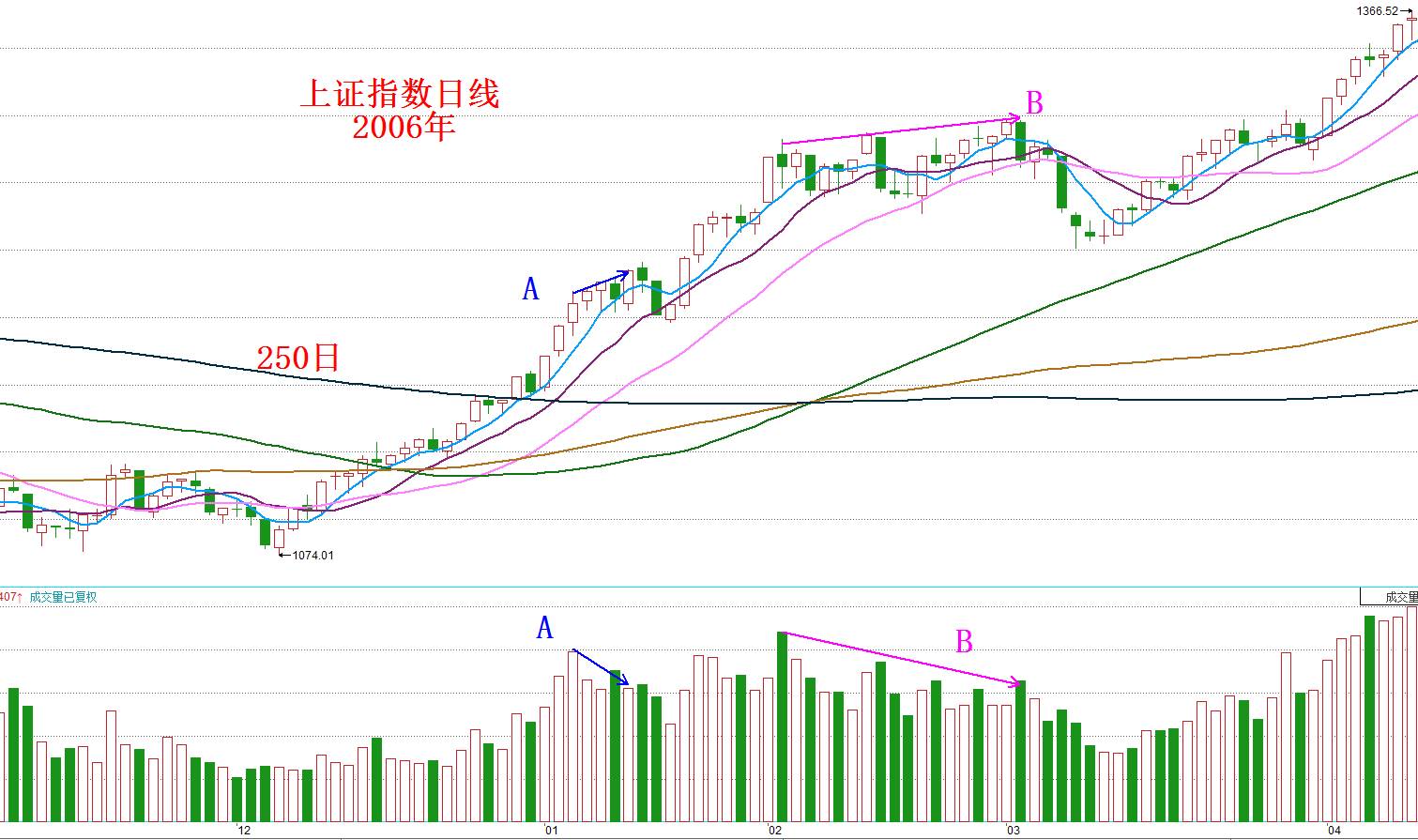 这张图读者应该不会陌生,过去我们在讲述250日均线时曾经多次提到。可以看到,现在的上证指数和当时亦非常类似,都是突破250日均线后便一路上扬。我们今天主要讨论的是图中所标示的A和B两处量价背离。