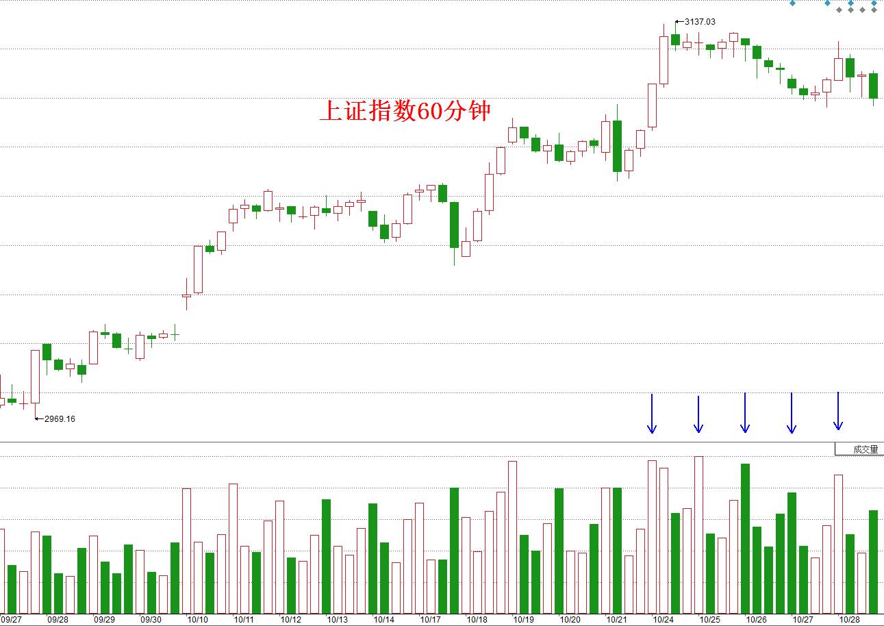 周五上证指数早盘冲至3128点而后回落,未能越过3137点创出新高的原因是成交量无法放大,显示做多资金的犹豫,请看下面这张上证指数60分钟线图:
