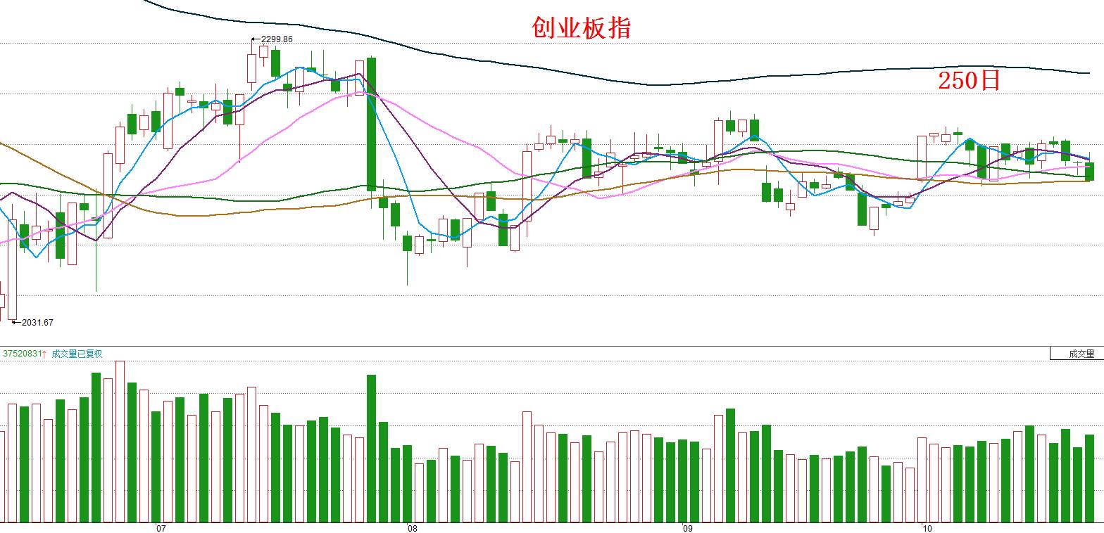国庆节后创业板指收出了一根带缺口的长阳,之后这个缺口屡屡成为了创业板指的有效支撑。一旦这个缺口被封闭,那就意味着国庆节前的洗盘是白洗了,是以姚尧认为创业板指回落到达这个位置后,要再下跌的空间也不大了。只是从基本面看,市场普遍认为随着经济回暖,传统产业的确定性更高,科技创新则相对受到冷落。从技术面看,250日均线依然高高在上,是以创业板跌固然跌不下去,涨却也还不到时候,需要再忍受一段时间的洗盘。待到市场普遍对蓝筹股乐观后,或许就是创业板准备腾飞之时。