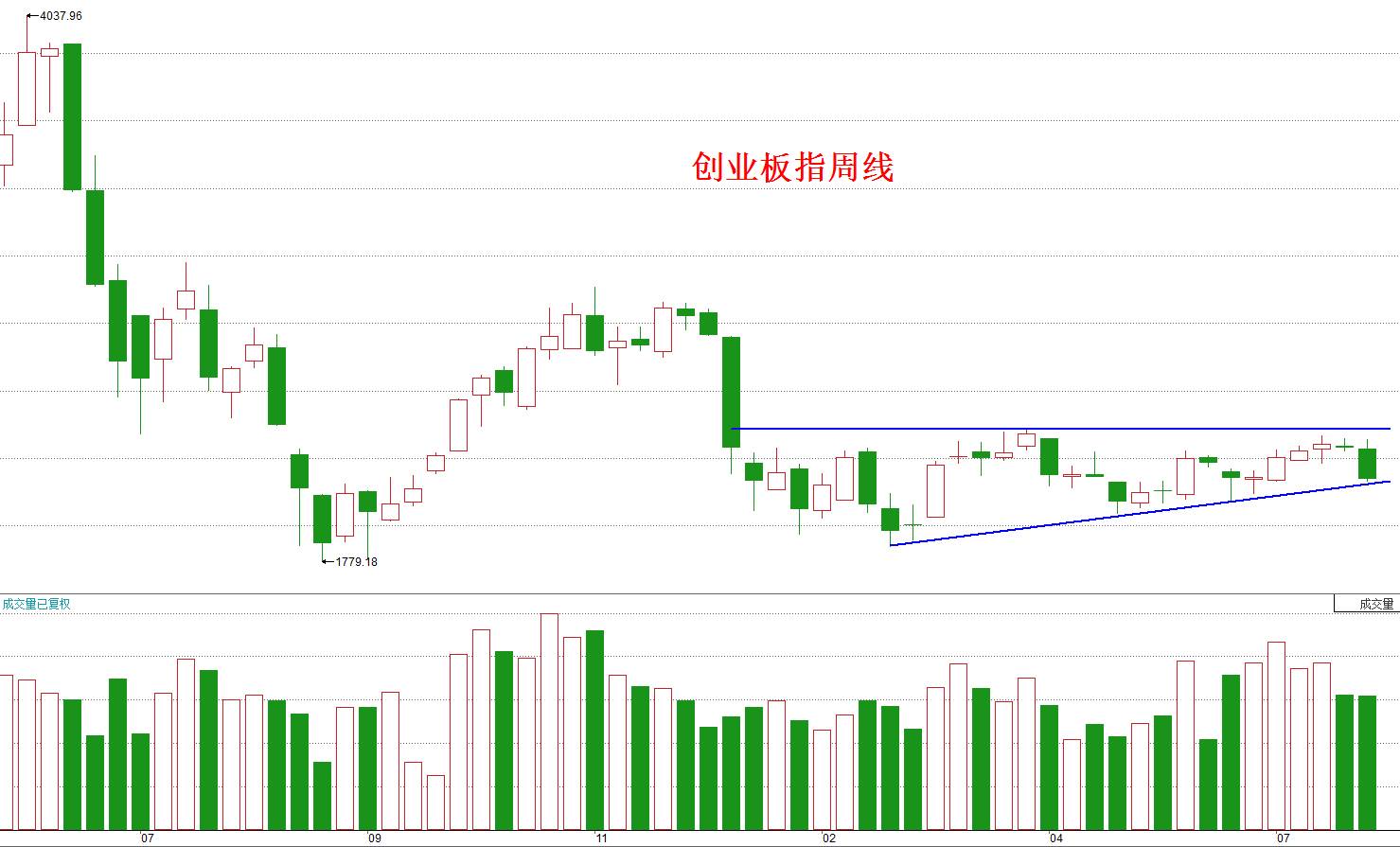 可以看到,创业板指的周线已经触碰到三角形的下沿,是以下周出现反弹的概率极大。对于创业板指接下来的走势,我认为有两种可能,第一种是领先上证指数向上突破,因其股性活跃,是以在九月中上旬就突破了三角形的上边沿。第二种是在三角形区间内反复震荡,相较上证指数可能就只剩下一个来回,创业板指出现两三个来回,最后和上证指数一起向上突破。