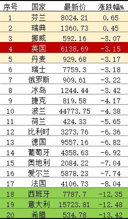 下面这张表是我在东方财富网上截取的二十个欧洲国家24日的股市表现: