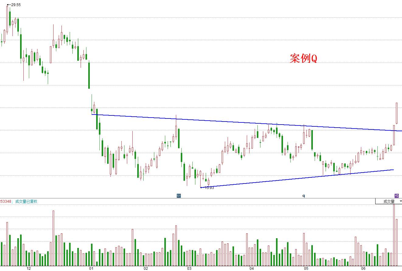 在《6月17日股市前瞻》中分析案例Q时,姚尧写道:“从上图中可以看到,案例Q似乎也是在做类似的三角形底部,只是它距离颈线位置尚远,现在成交量也很低迷。相对于案例F的“过”来说,案例Q的现状是“不及”。未来它会放量突破颈线吗?对此我也不能确定。如果大盘接下来走势疲软,可能它就继续盘整下去了。如果大盘接下来走势凌厉,那它就有可能对颈线发起冲击。所以,你有必要因为错过案例B今天的上涨而懊悔吗?你有必要担心自己会踏空牛市吗?真到牛市来的那天,会有一个接一个的股票突破底部而持续拉升,关键是你要有本事、有准备。”