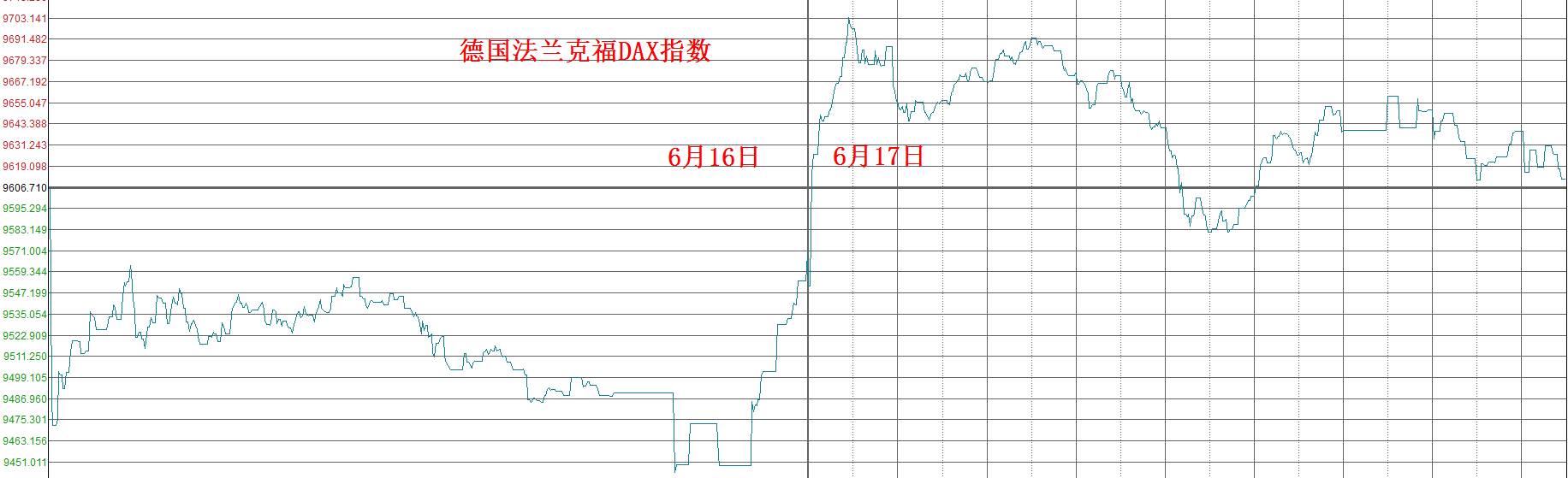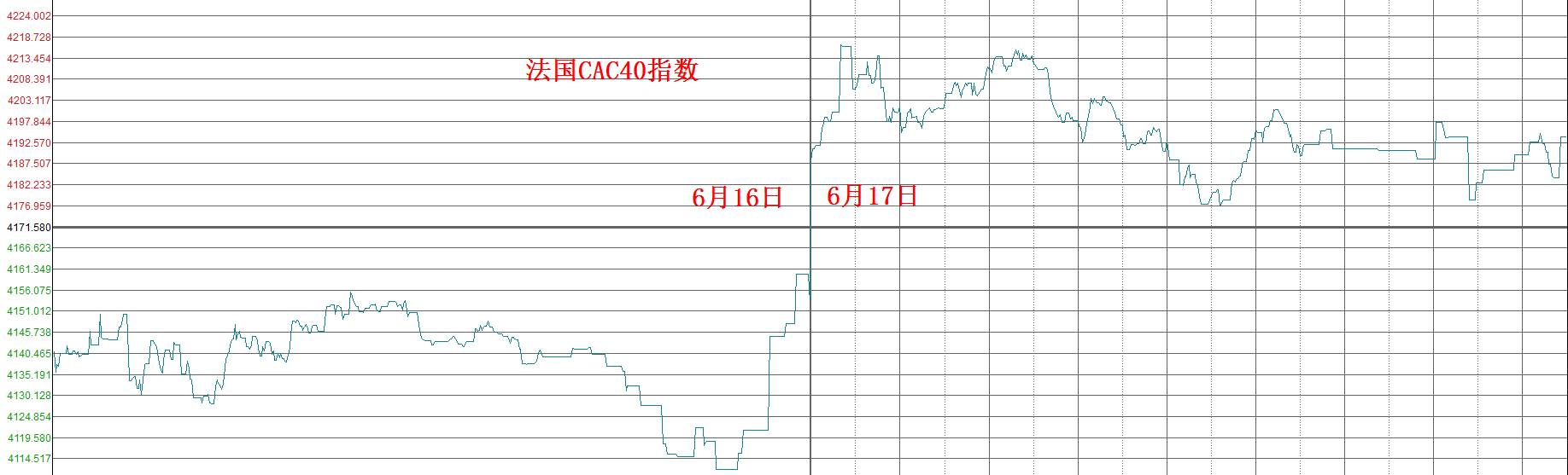 从上图中可以看出,欧洲三大股指的走势是完全雷同的,即在北京时间22:00点之前还是下跌,22:00之后开始止跌回升。又因为北京时间23:30分欧洲股市交易就结束了,所以第二天开盘后欧洲股市继续大涨了一波。