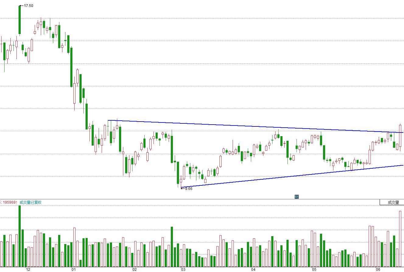 可以看到这档股票刚好构筑完一个三角形底部,近期成交量明显放大,朝着三角形的上颈线发起冲击。前天,该股本来是有希望突破颈线的,可惜受大盘暴跌拖累而跌了下来。昨天,该股随大盘小幅上涨,今天该股再次放巨量突破颈线。我看到这档个股的时候是今天中午,早盘结束时已经稍稍突破了颈线,而且成交量出现明显放大,所以我在下午开盘时就稍微买了点做跟进。其实基本面也没来得及仔细研究,就感觉图形不错,而我一直在跟大家讲的底部结构完整就是这个意思。你再回头看看我们现在的上证指数和创业板指,你觉得有那么个意思吗?你看它能算是哪种性质的底部,颈线又设在哪里?今天虽然上涨了,可它能是放量突破颈线的标志性K线吗?