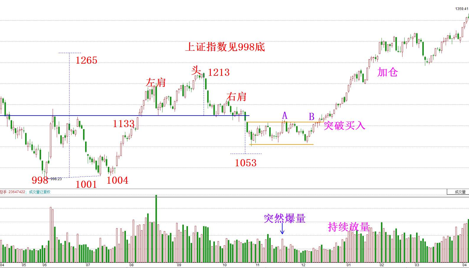 通过对比当初和现在上证指数的走势图,我们已经成功印证了自双底以来的全部走势,而今天这根放量阳线的位置特别像图中的A点:同样是跌破颈线后的17天左右,同样是放量上涨,同样是封闭缺口。可是,A点之后的走势是继续回落筑底的,我们真正想要的是图中B点的位置。A点和B点的不同之处体现在两个方面: