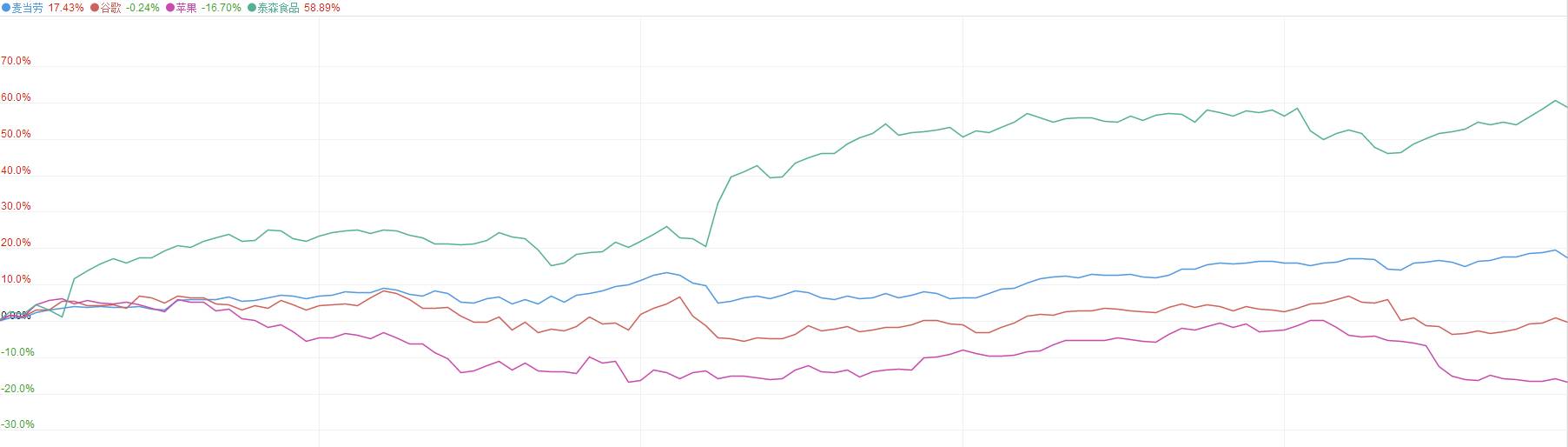 这是四支美股近六个月来的走势图,最上面一条绿色线是泰森食品的股价,它是已有八十年多历史,全球最大的鸡肉、牛肉、猪肉生产商及供应商之一。近六个月来,其涨幅高达58.89%。第二条蓝色线是麦当劳的股价,其近六个月涨幅为17.43%。第三条棕色线是谷歌的股价,其近六个月涨幅为-0.24%。第四条紫色线是苹果的股价,其近六个月涨幅为-16.7%。归纳来说就是,近半年来以食品股为代表的传统产业股涨幅远胜于以科技股为代表的新兴成长股,而许多有经验的投资者都知道,通常牛市都是以科技创新类的成长股打先锋,只有成长股涨不动了才轮到防守型的食品股上涨。因此,我仍然相信,长线来看索罗斯做空美股的决策是正确的,美股未来必有一波大跌。那么,如果A股这个时候处在相对高位,会被美股的下跌拖累吗?从这个角度而言,我觉得A股现在不要大涨反而更好。等美股的风险释放完毕了,A股的底部结构应该也就能构筑好了。